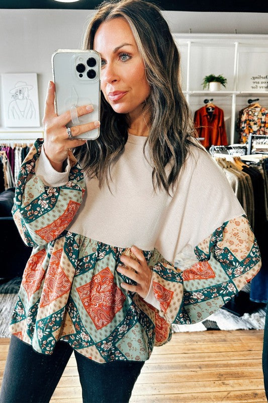 Geometric Patchwork Crew Neck Loose Fit Top - Khaki / S