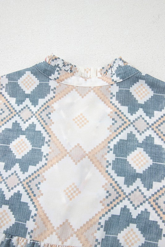 Print Tassel Tie Split Neck Balloon Sleeve Blouse Sale