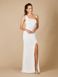 Beaded sheath gown. The gown features sleeveless one shoulder detail with side front slit