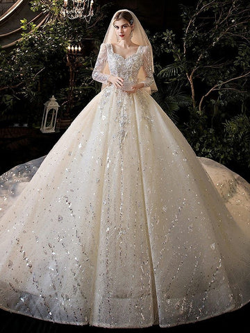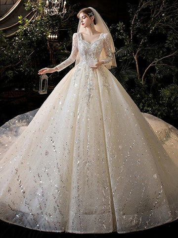 Actual Images: YesNeckline: V-neckSleeve Length(cm): FullWedding Dress Fabric: Tulle & Radiant Taffeta with LaceTrain: Sweep/ Brush TrainFor Pregnant Women: YesDresses Length: Floor-LengthBack Design: Lace-UpItem Type: Wedding DressesSleeve Style: RegularBuilt-in Bra: Yesis_customized: YesDecoration: AppliquesDecoration: BeadingDecoration: CrystalDecoration: EmbroideryDecoration: LaceDecoration: SequinedFashion Element: LuxuryModel Number: EF56098Waistline: PrincessSilhouette: Ball Gown