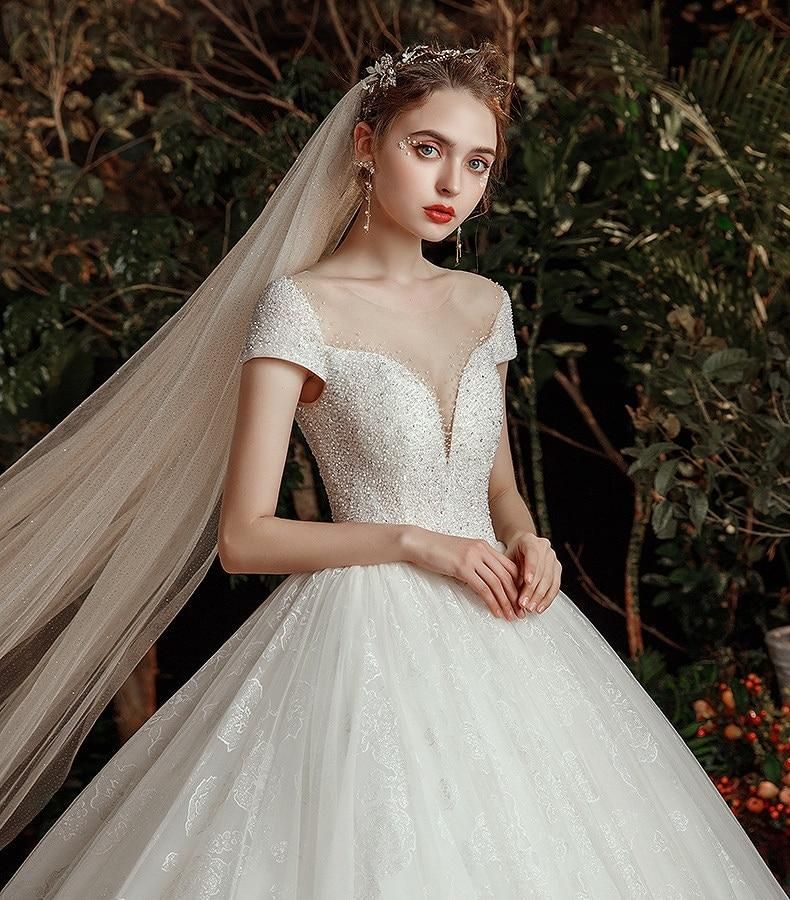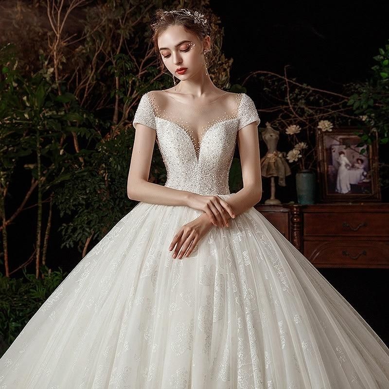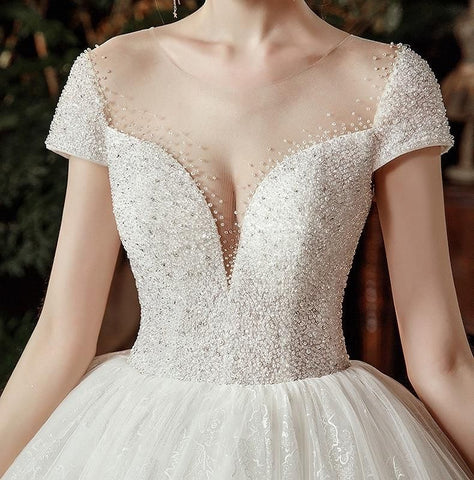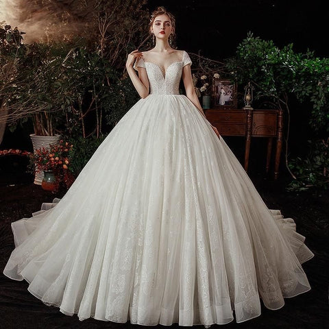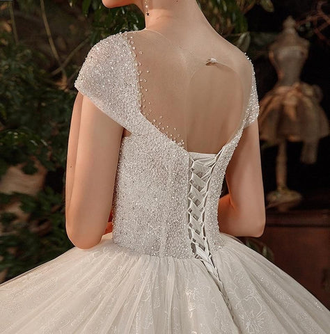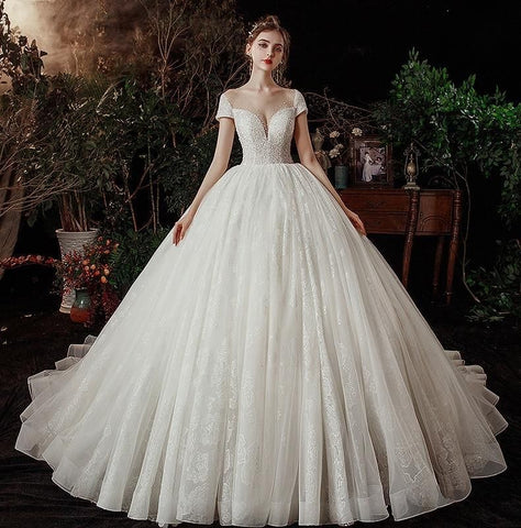 Actual Images: YesNeckline: O-NeckSleeve Length(cm): ShortWedding Dress Fabric: Tulle & Radiant Taffeta with LaceTrain: Sweep/ Brush TrainFor Pregnant Women: YesDresses Length: Floor-LengthBack Design: BacklessItem Type: Wedding DressesSleeve Style: RegularBuilt-in Bra: Yesis_customized: YesDecoration: AppliquesDecoration: BeadingDecoration: CrystalDecoration: EmbroideryDecoration: LaceDecoration: SequinedFashion Element: vintageModel Number: IEF564Waistline: NaturalSilhouette: Ball Gown