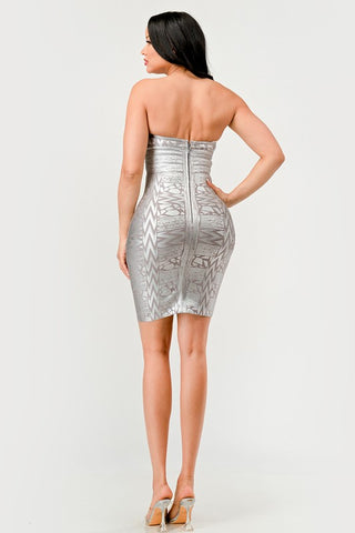 Introducing the \"Gilded Glamour Strapless Dress,\" a stunning display of elegance and contemporary design. The strapless sweetheart neckline gracefully accentuates the shoulders, offering a tasteful hint of allure. Adorned with radiant silver embellishments, the bodice shines with an array of carefully placed beads and sequins that mimic the intricate patterns of baroque artistry, yet with a distinctly modern flair. The fabric, in a muted champagne shade, glimmers subtly, complementing the body's natural curves with its form-fitting silhouette.