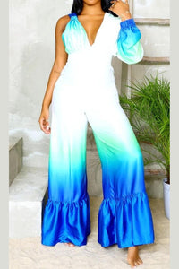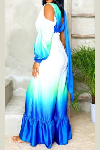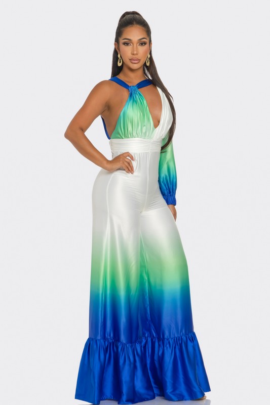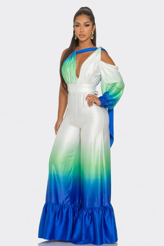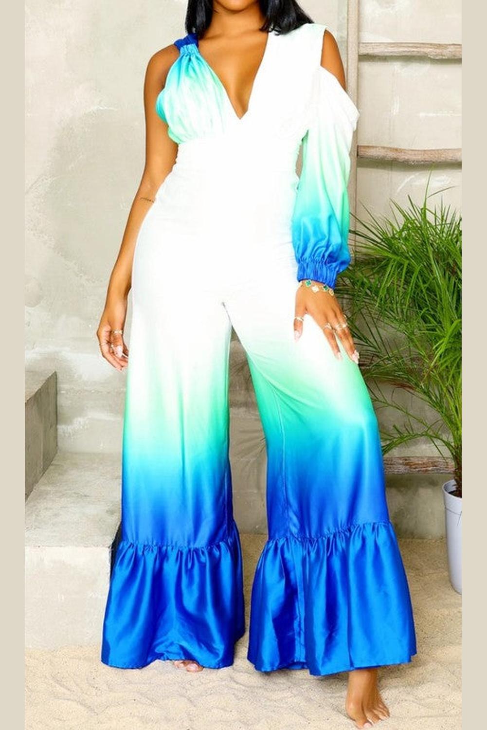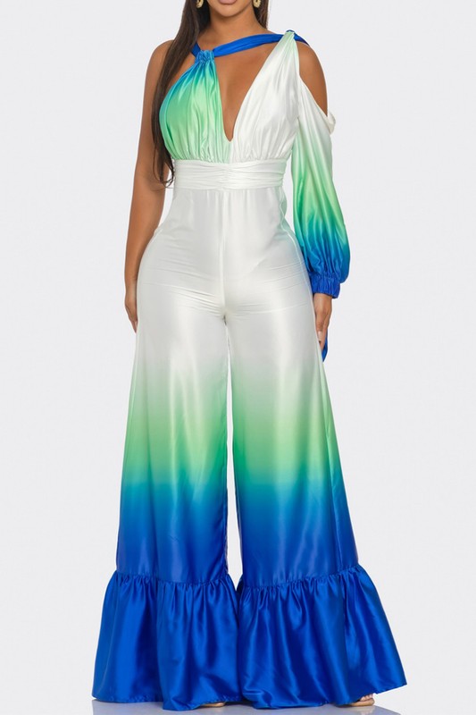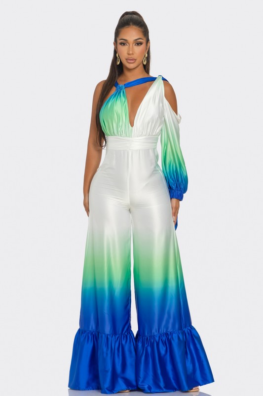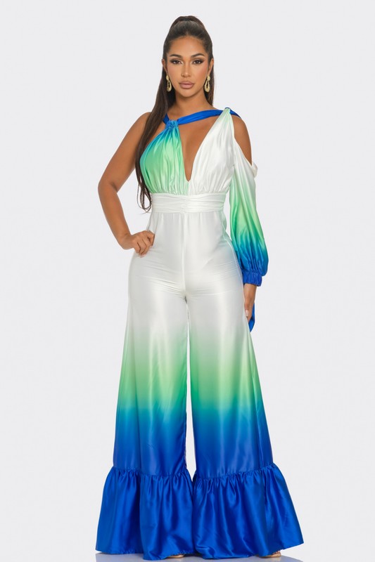 This eye-catching piece features a captivating ombre design that transitions from serene green to vibrant blue, reminiscent of ocean waves. Crafted from luxurious satin, it offers a silky-smooth feel and an elegant drape. The jumpsuit boasts a deep V-neckline, a cinched waist for a flattering silhouette, and an alluring one-shoulder design with a long sleeve on the other side. The wide-leg pants add a touch of glamour and sophistication, making it perfect for any special occasion. Embrace the beauty of the sea and exude confidence with this breathtaking jumpsuit.