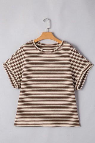 Rock this T-shirt with its timeless striped pattern, perfect for any occasion. Its textured fabric adds a unique touch while the dolman short sleeve and side slits bring a modern twist. The crew neck design is classic and comfy, making this top a versatile and must-have piece.