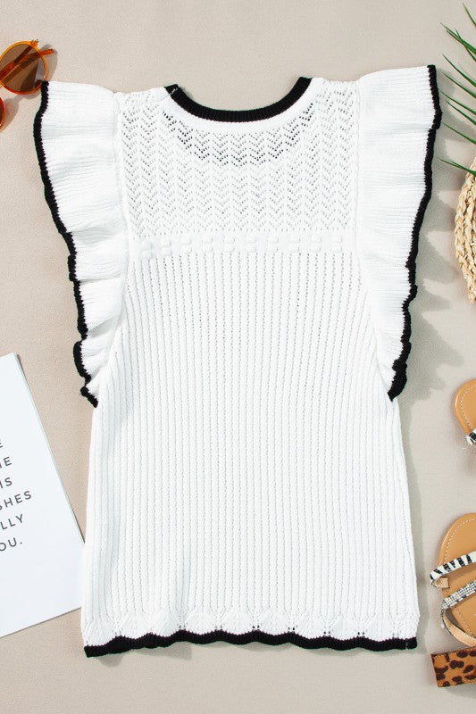 Dress to impress with this Alaya Crochet Tank Top, complete with a contrast flounced trim that is sure to catch every eye. Its graceful and elegant crochet knit fabric adds a touch of class to any outfit, especially when paired with high-waisted bottoms. Perfect for any social occasion, this knitted vest will elevate your look to new heights.