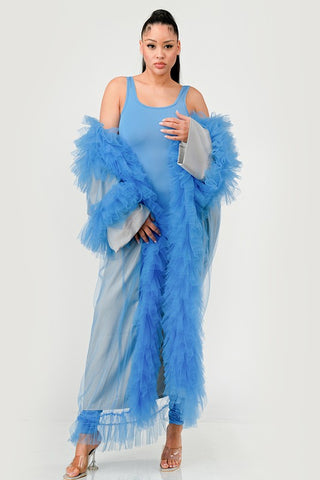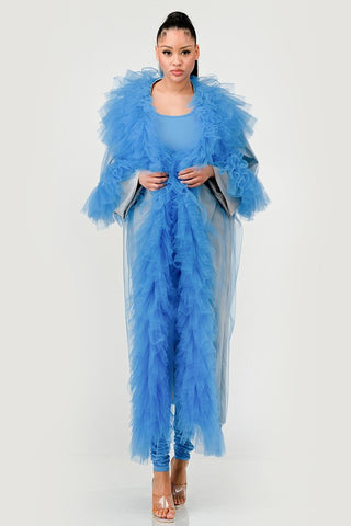 The Azure Dreamcape Set offers an ethereal blend of elegance and whimsy, perfect for those who command a bold yet graceful presence. The centerpiece of this ensemble is a billowing cape, made from layers of soft tulle in a captivating azure blue, creating a voluminous cascade that flows with dreamlike quality.