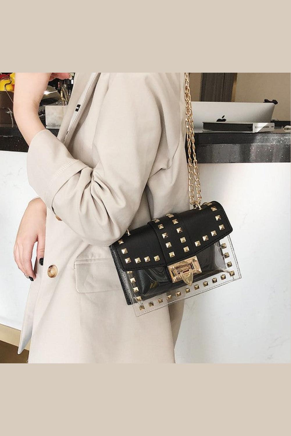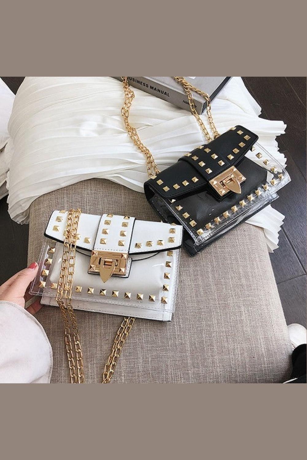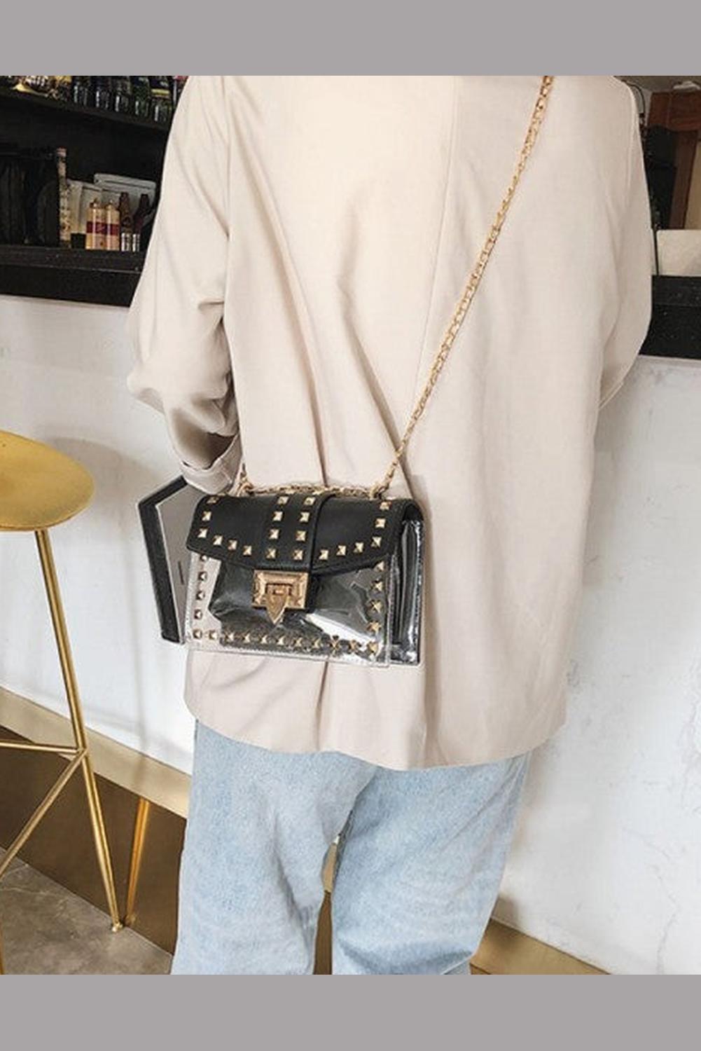 Gold studs delineate this fun, semi see-through bag. Clear on the front but comes with a removable pouch, in the same color of the bag, roomy enough to fit your essentials.
