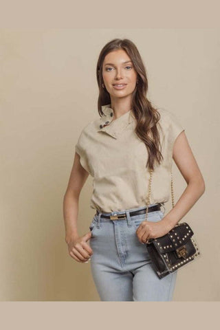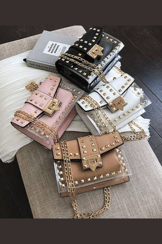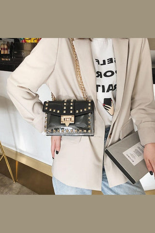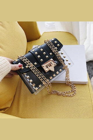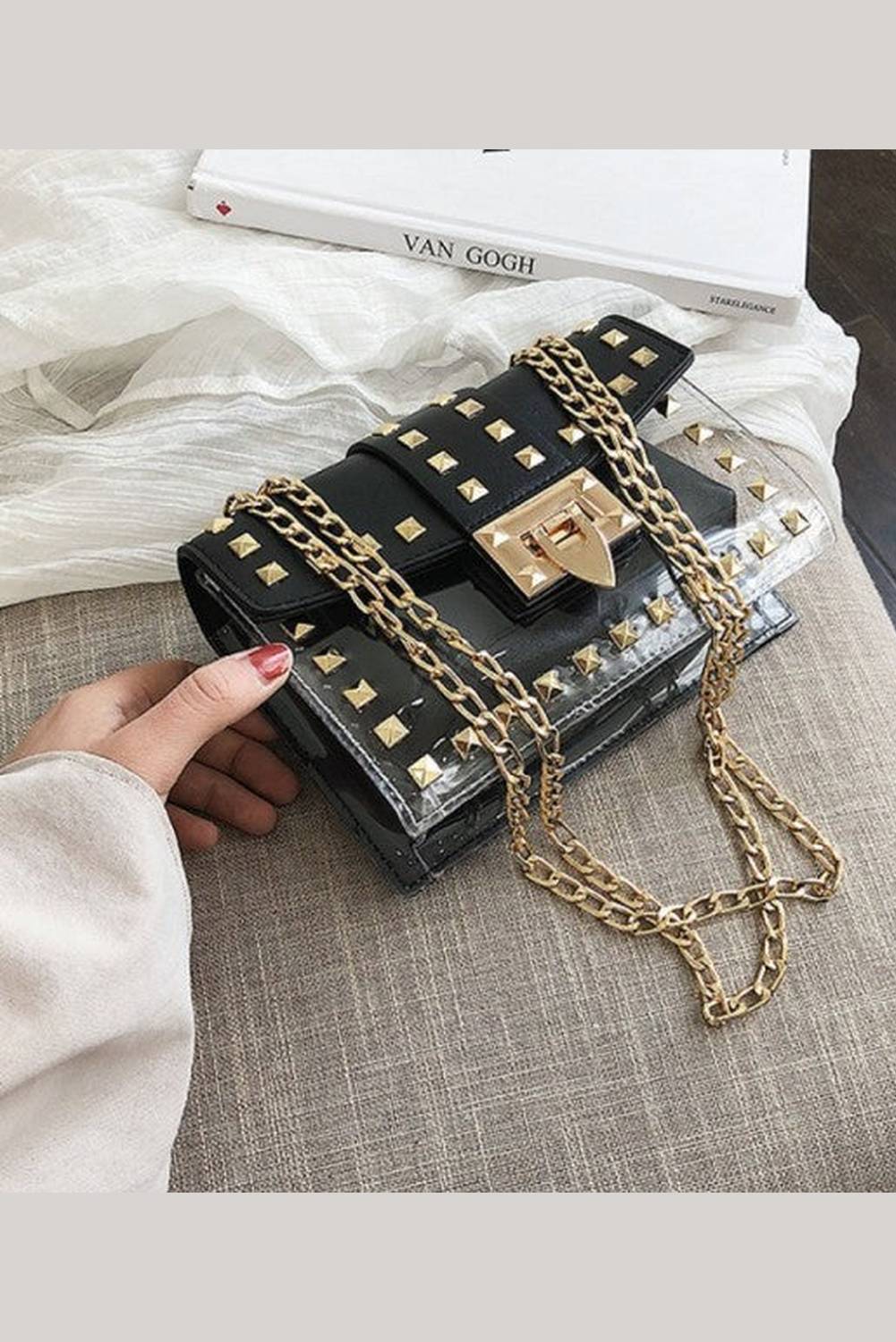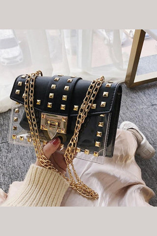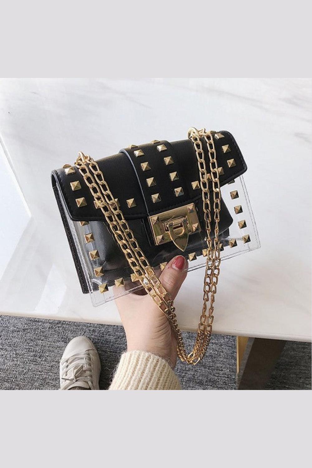 Gold studs delineate this fun, semi see-through bag. Clear on the front but comes with a removable pouch, in the same color of the bag, roomy enough to fit your essentials.