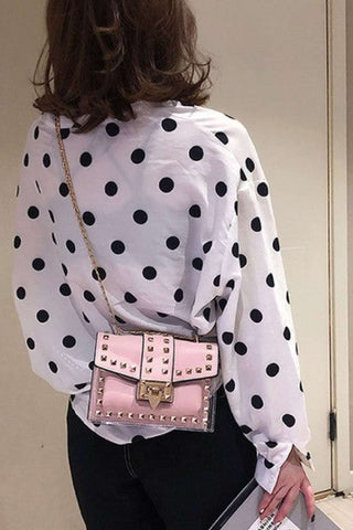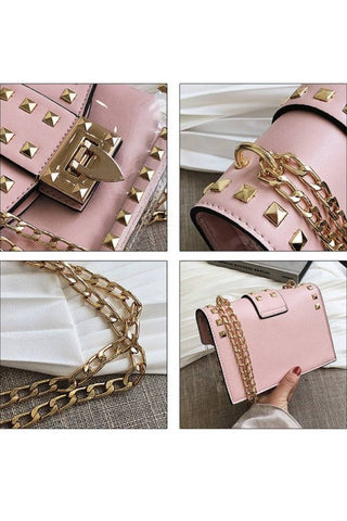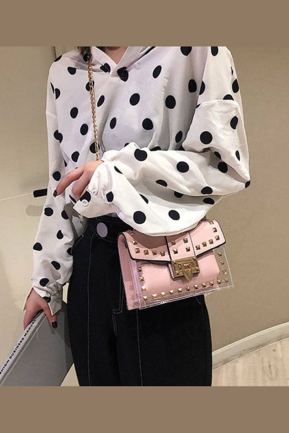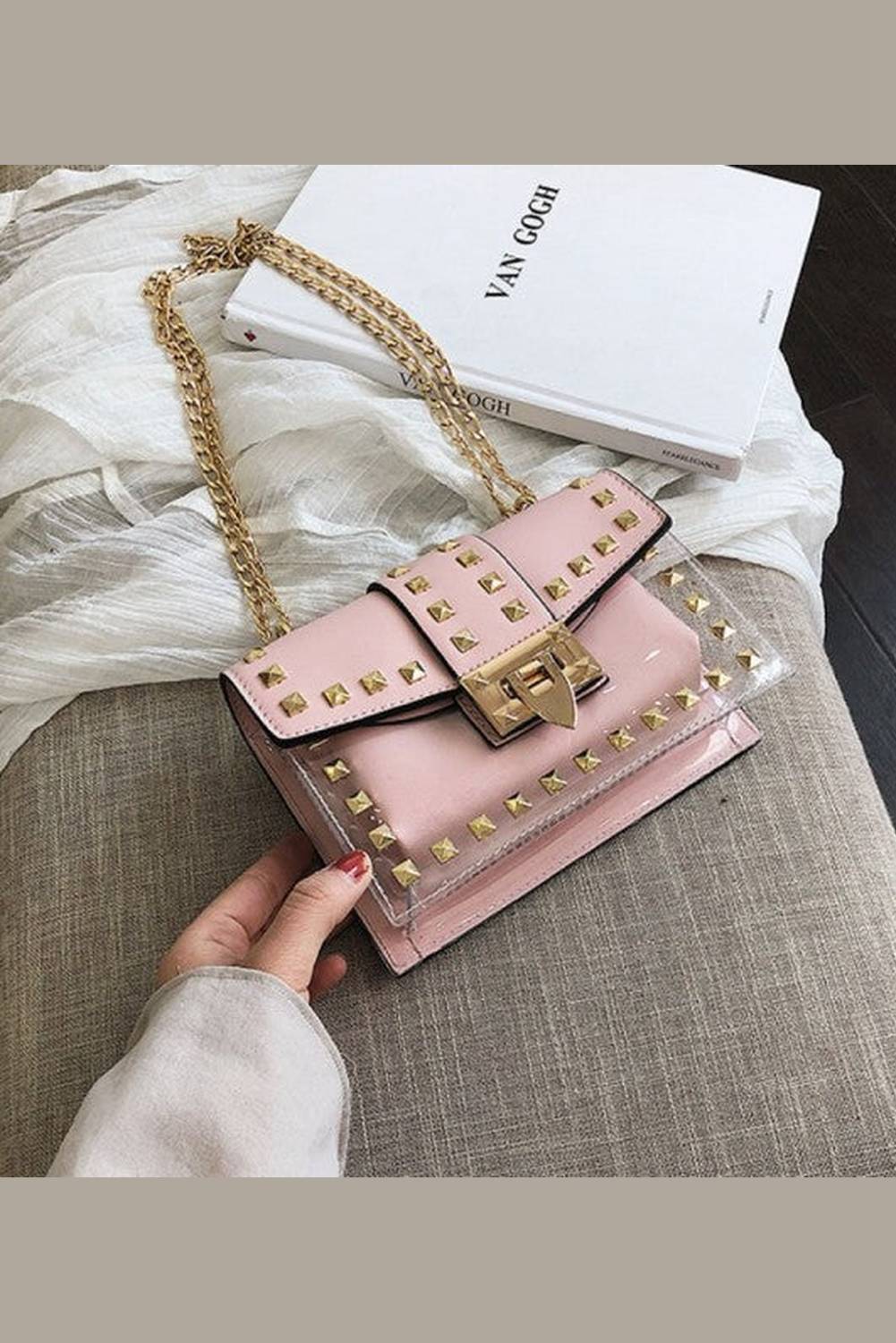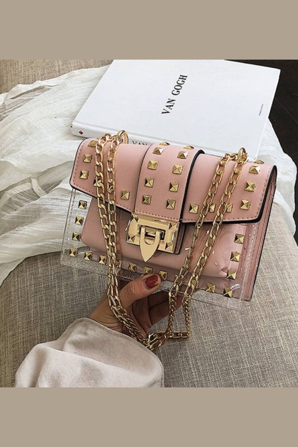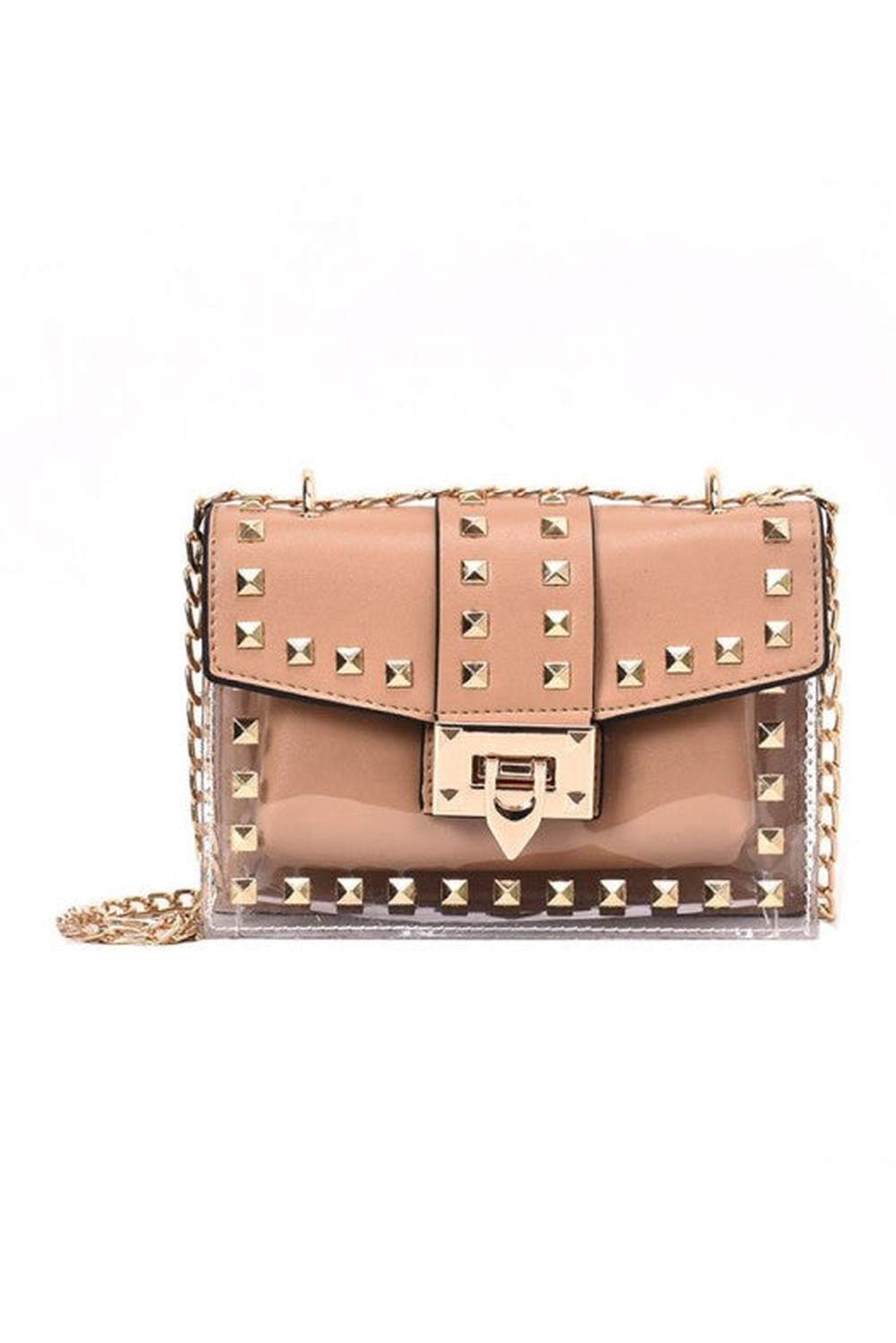 Gold studs delineate this fun, semi see-through bag. Clear on the front but comes with a removable pouch, in the same color of the bag, roomy enough to fit your essentials.