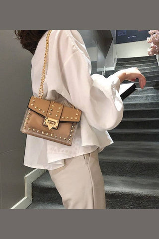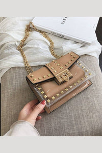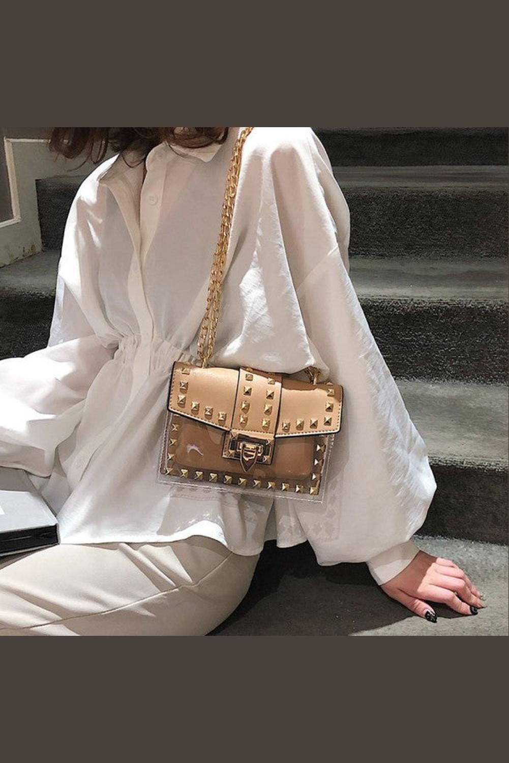 Gold studs delineate this fun, semi see-through bag. Clear on the front but comes with a removable pouch, in the same color of the bag, roomy enough to fit your essentials.