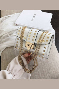 Chain handle that can double up to carry as a shorter shoulder bag. Available in White, Tan, Rose and Black.
