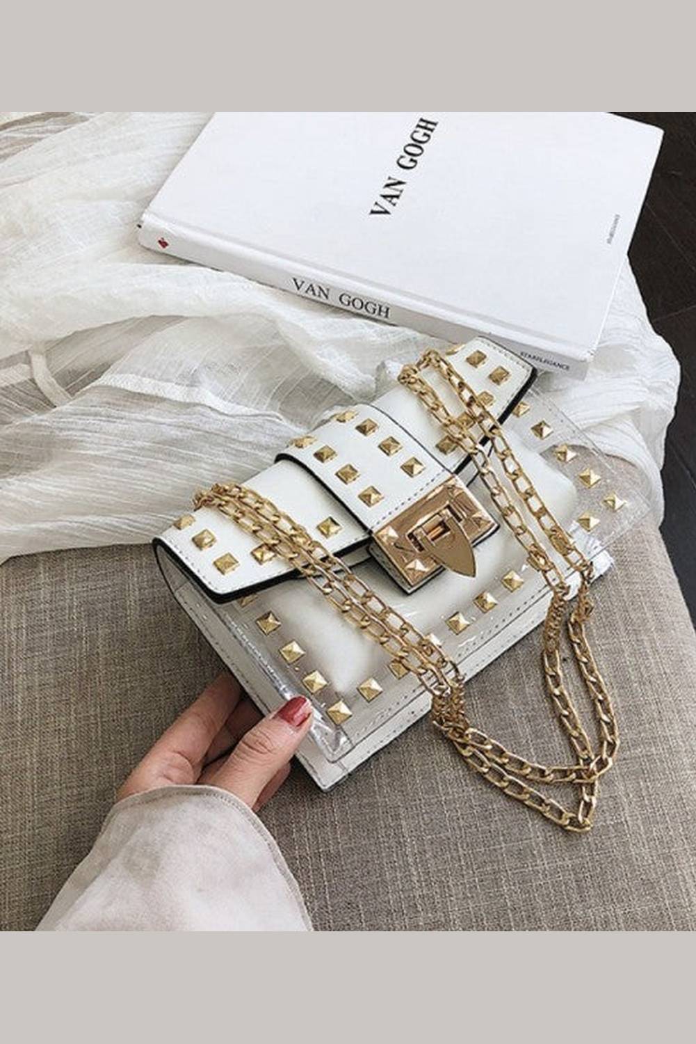 Gold studs delineate this fun, semi see-through bag. Clear on the front but comes with a removable pouch, in the same color of the bag, roomy enough to fit your essentials.