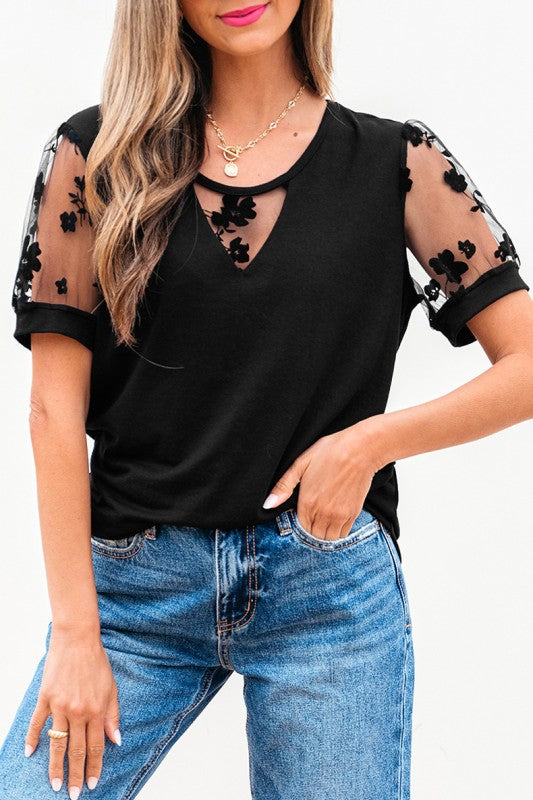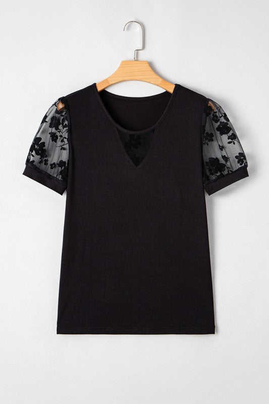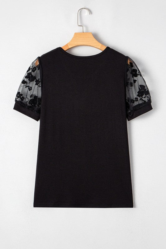Black t shirt with mesh puff sleeve is flattering and elegant.