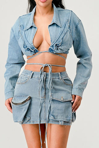 Meet the ultimate denim game-changer: our Denim Desire Crop Jacket. This piece is a bold twist on classic denim with its cropped length, tie-front detail, and striking collar design. Perfect for layering over your favorite looks, it adds an edgy yet playful touch to any outfit.