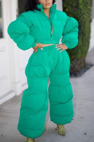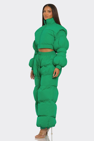 The cropped puffer jacket features exaggerated balloon sleeves and a sleek zip-front closure, making it perfect for layering or standing out on its own. The high-waisted quilted pants complete the set, offering a relaxed yet dramatic silhouette with their oversized design and cushioned fabric that mimics the comfort of your favorite puffer coat.
