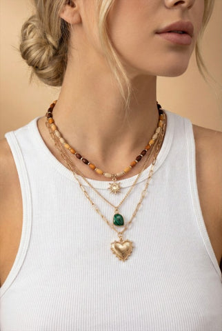 The longest strand is a medium link chain showcasing a green stone pendant and a textured gold heart charm for a playful and romantic finish.