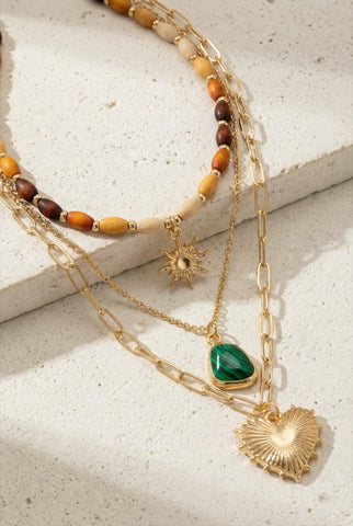 Layered necklace featuring three coordinated strands with a warm, earthy aesthetic.